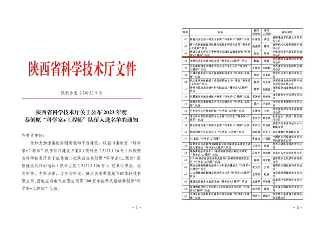 喜报!ok138cn太阳集团入选2023年陕西秦创原“科学家+工程师”队伍名单