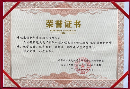 公司被中铁武汉电气化局成都轨道交通8号线一期工程系统1标项目部评为“2019年优质供货商”