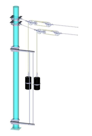 应用范围: 用于 350km/h 及以下电气化铁路接触网线索的下锚补偿。装置组成: 滑轮补偿组、 滑轮下锚底座、 坠砣限制架、 拉线底座、 坠砣杆等。